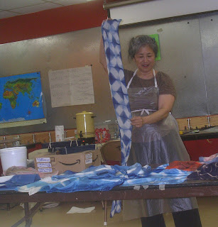 The most fascinating aspect for me, an indigo novice, was pulling the dyed piece from the indigo vat and watching it "bloom" from pale green when removed from the dye bath to dark blue after exposure to oxygen. Wow.